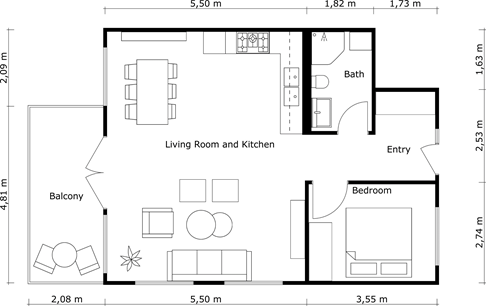 Es gibt in der RoomSketcher App verschiedene Wege, um 2D Grundrissen Außenbemaßungen hinzuzufügen. In diesem Artikel wird beschrieben, wie eine Außenmaßkette hinzugefügt wird, die so aussieht: