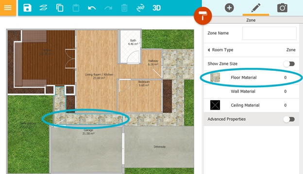 Hinweis: Wenn Sie die Bodenhöhe einer Zone anheben oder absenken, entsteht eine „Stufe“ nach oben oder unten, die möglicherweise mit Material versehen werden muss (oder sie erscheint weiß in Ihrem 3D Lageplan). Wählen Sie die Seite der Zone, die sichtbar ist, und klicken Sie auf Wandmaterial, um das Material an der Seite der Zone hinzuzufügen.