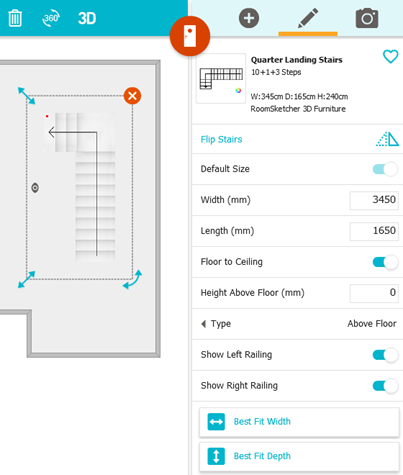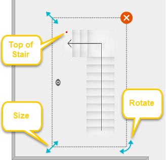 Once you have placed a stair on a floor plan, you can customize it. To customize its size and vertical (up and down) direction:
