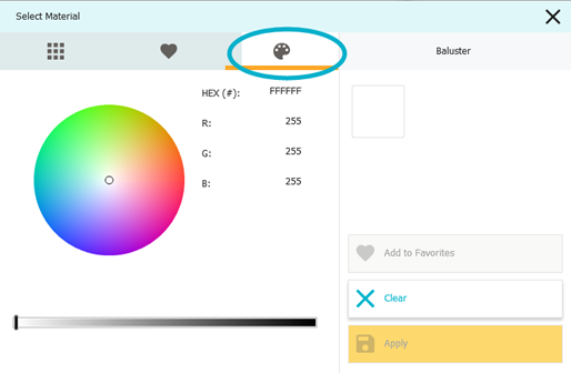 4. You can use the scroll bar to browse suggested materials, or in the Search, you can type a word, such as “Wood”, “Tile”, “Paint” or “Red”, to narrow your selection. You can also click the Paint Palette to type a hex color code or RGB code to specify a custom color.